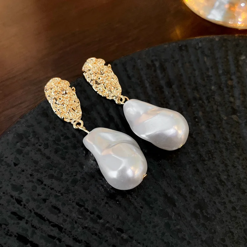 Elevate your style with these elegant baroque pearl drop earrings featuring lustrous irregular pearls suspended from textured gold-tone studs. These sophisticated accessories combine classic pearl beauty with modern geometric design for timeless appeal.