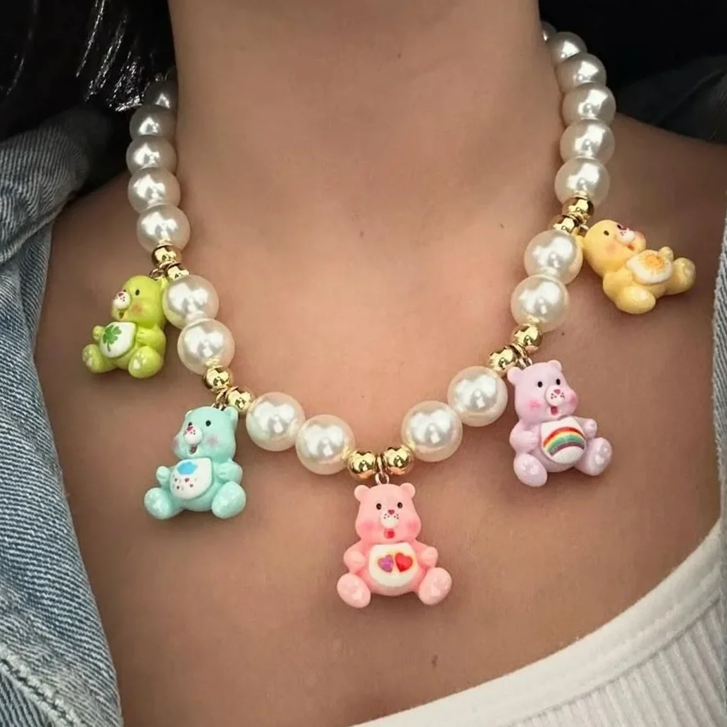 Whimsical handmade bear pendant necklace with colorful acrylic heart beads that brings joy to any look.