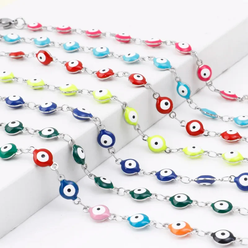 Crafted from durable stainless steel with colorful enamel evil eye charms that resist fading and chipping. The stainless steel construction provides hypoallergenic properties and exceptional durability for daily wear. The vibrant enamel coating on each charm maintains its bright colors even with exposure to sun, water, and daily activities. The secure lobster clasp closure ensures reliable wear during active summer pursuits.