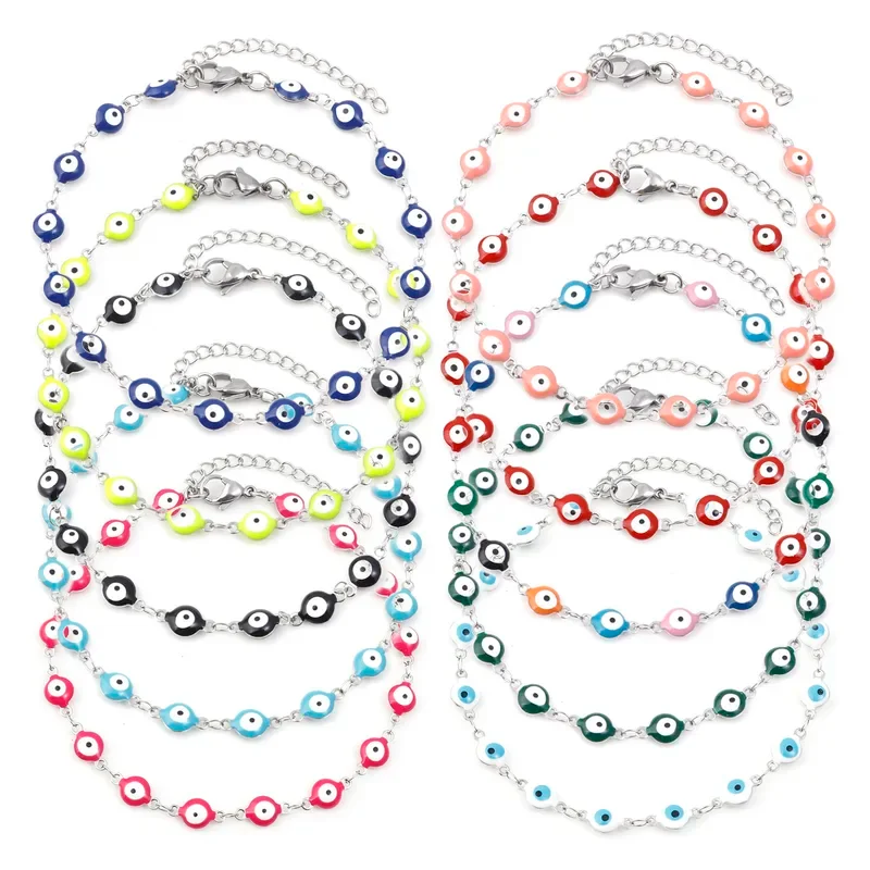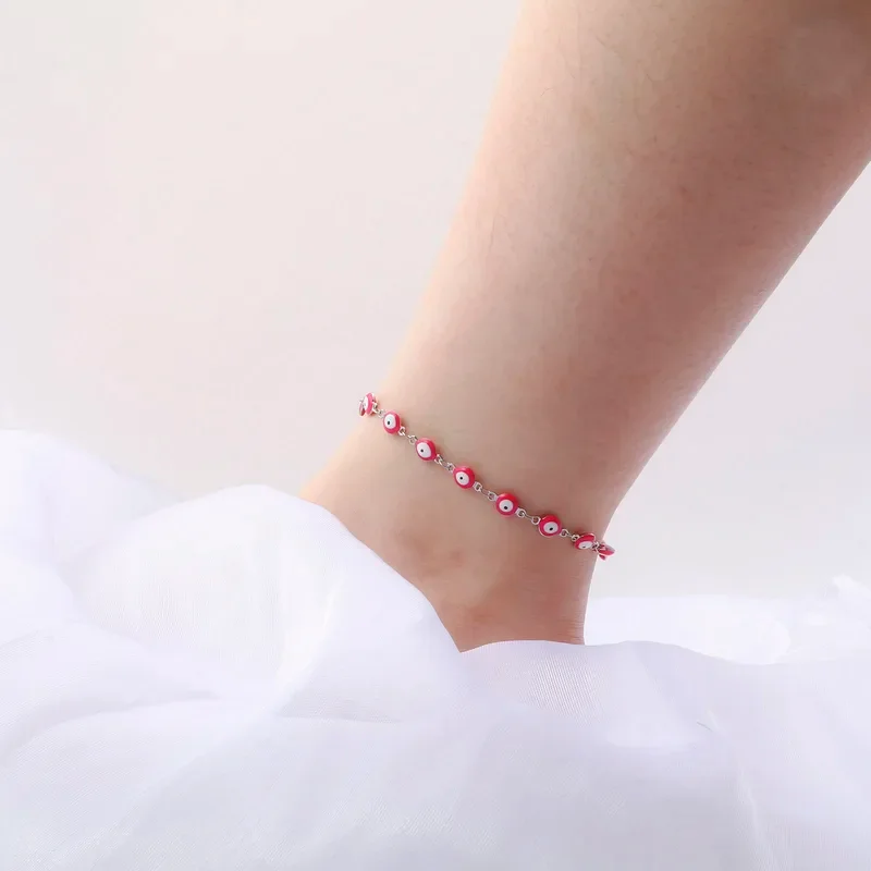 Available with multicolor evil eye charms in various bright enamel finishes including traditional blue, cheerful pink, sunny yellow, vibrant green, and classic black. The stainless steel chain provides durability and tarnish resistance, while the adjustable design accommodates different ankle sizes for comfortable wear.