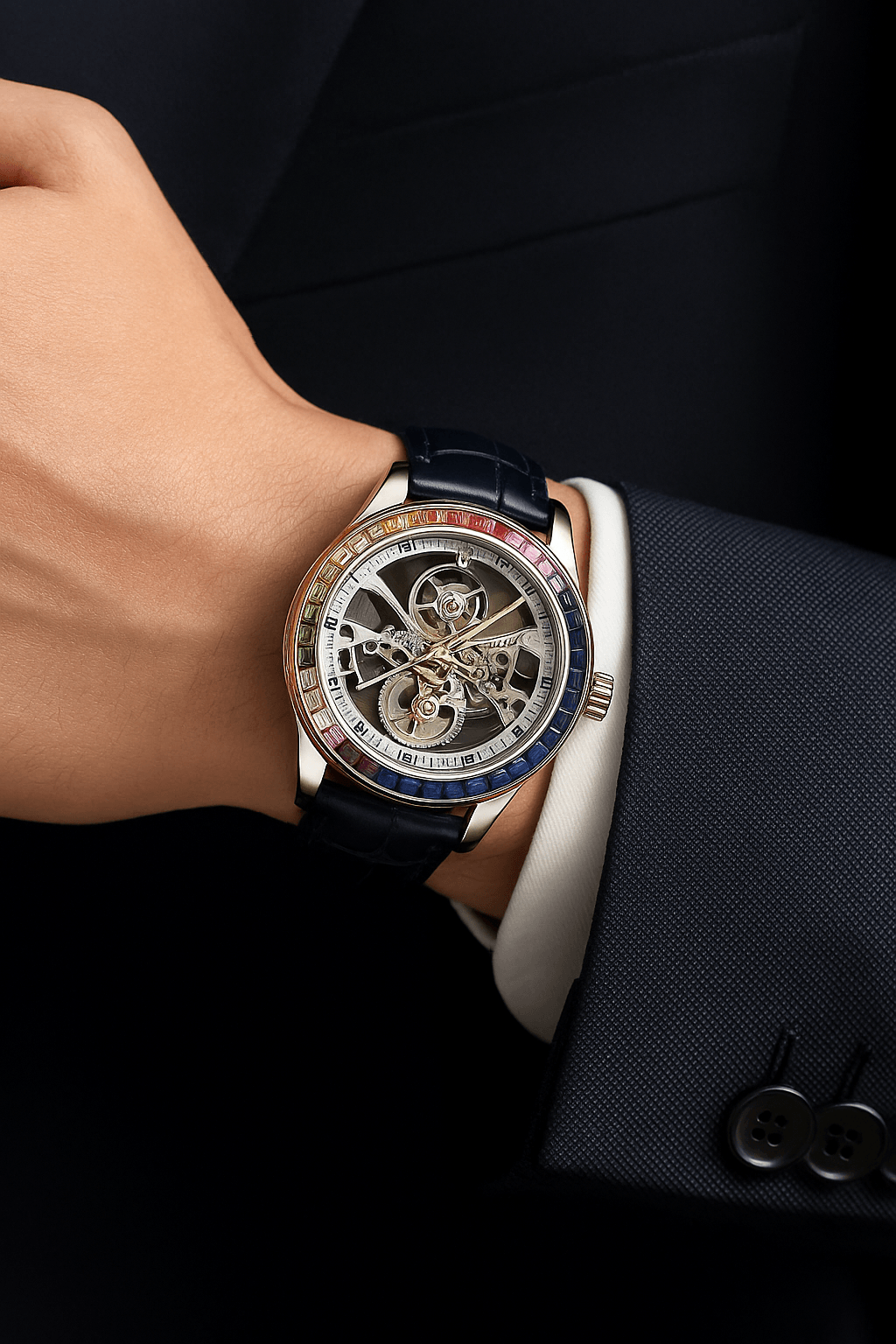 Make a statement with this luxury skeleton timepiece showcasing brilliant crystals and intricate mechanical details.