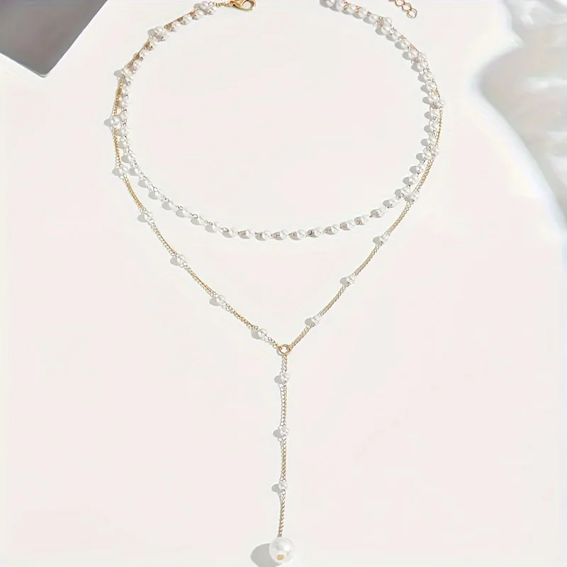 This double-layer necklace combines delicate pearl beads with refined gold-toned chain elements. The upper layer features lustrous imitation pearls in a classic choker style, while the lower layer extends with a tassel pendant adorned with cascading pearl details. The asymmetrical design creates visual interest and movement, with the elongated tassel adding contemporary appeal to the timeless pearl aesthetic.