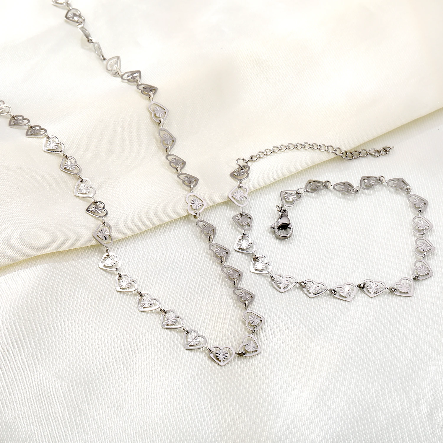This coordinated jewelry set features delicate heart-shaped links that create a romantic chain pattern throughout both pieces. The classic silver tone adds timeless appeal while the uniform heart motif creates a cohesive, polished look. Perfect for layering or wearing as a complete statement set.
