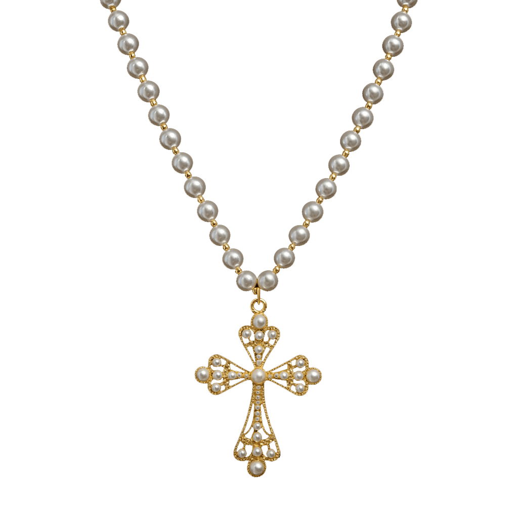 A strand of pearl beads holds a large gold-tone cross pendant with ornate detailing and embedded faux pearls. Designed to stand out with structured symmetry and classic contrast.